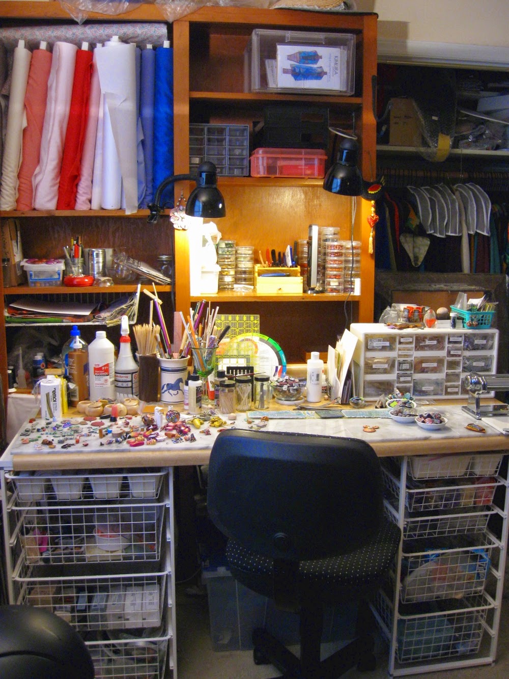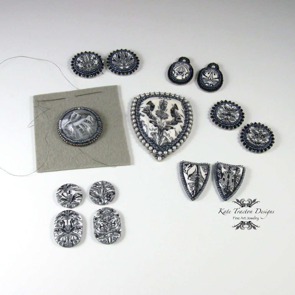 My piece began with the creation of the yellow polymer clay cabochons. When I use the "inside out bead" or "Natasha" bead technique, the final result is a random, mysterious surprise. In this case, I cleaned up my work table after a particularly productive day and used the leftover clay scraps to make some cabs. When I opened the resulting log of patterned clay, my reaction was, "OMG, I need to save these for my Battle piece!" (The two on the bottom of the finished necklace.)