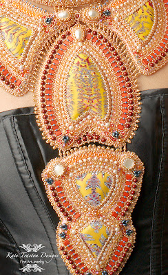 As I began embellishing the two clay cabs, it became obvious that this necklace wanted DRAMA: color... sparkle... texture... the thing practically screamed, "Gimme!" When that section was complete, my plan was to connect it to the collar and call it done. My dear friend, Mikkey, looked at it and told me it was "very nice, but it won't have a chance at winning... not big enough". Nice.
